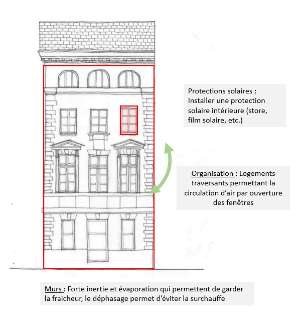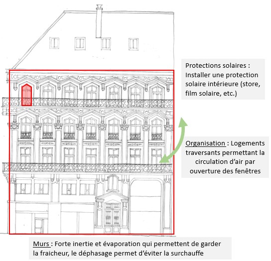 | Les aspects variables : | Isolation thermique et inertie : Les parois ne sont pas isolées, mais les murs sont épais et ont une bonne inertie. Orientation du bâtiment : L’orientation influence les apports solaires. Une disposition avec des ouvertures au sud, sud-est ou sud-ouest permet de maximiser les gains de chaleur en hiver. L’orientation des parois vitrées est vraiment spécifique à chaque bâtiment, notamment puisqu’ils suivent généralement le linéaire de la rue. Aménagements extérieurs : La végétation autour du bâtiment (lorsqu’elle existe) offre un confort visuel qui participe à se sentir bien dans les bâtiments. Cet aspect souvent négligé peut impacter le confort thermique des occupants. |