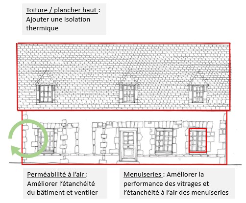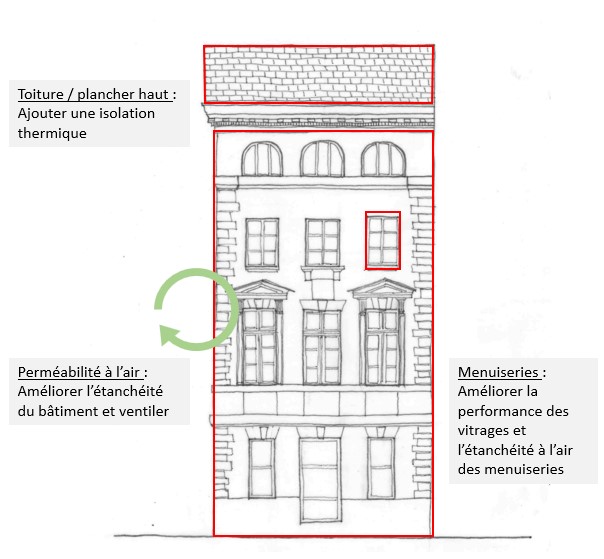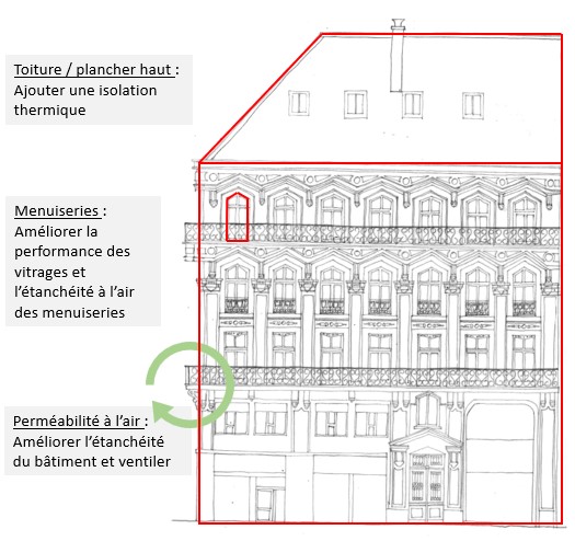 - Leviers pour améliorer la performance énergétique du bâtiment (3 points clés permettant d’améliorer la performance de l’enveloppe du bâtiment et qui ne déteriorent pas sa qualité patrimoniale) :