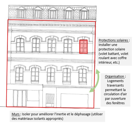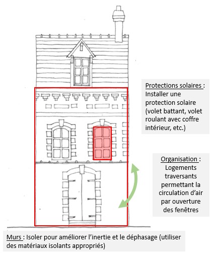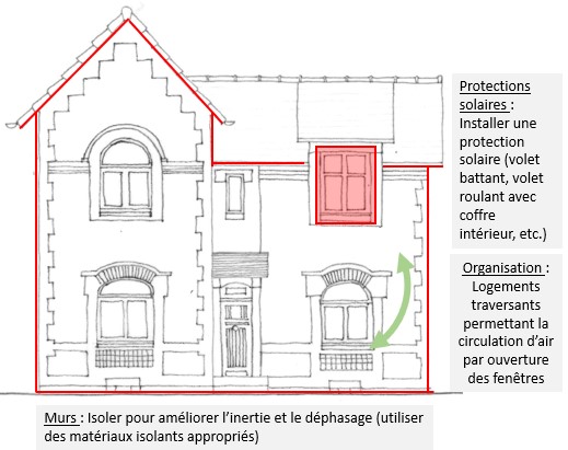 | Les aspects participant au confort en été : | Inertie thermique / déphasage : L’inertie et le déphasage permettent de lutter contre les vagues de chaleur (pas forcément très efficace sur les longues périodes de chaleur ou quand il fait très chaud). Protections solaires : Les dispositifs permettent de diminuer les apports solaires en été. |