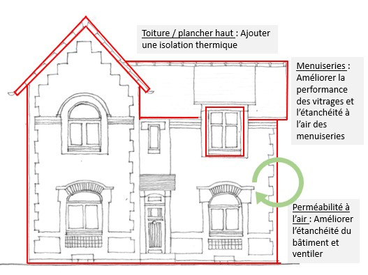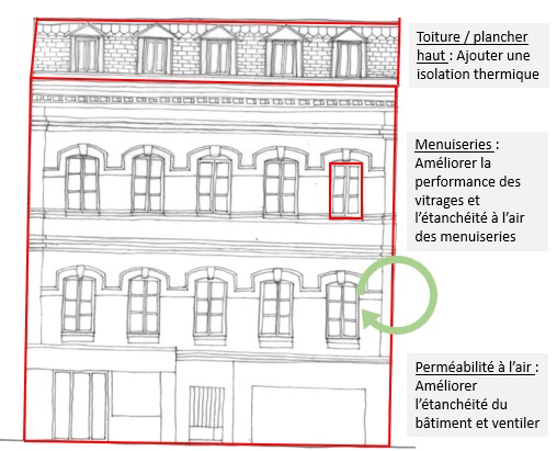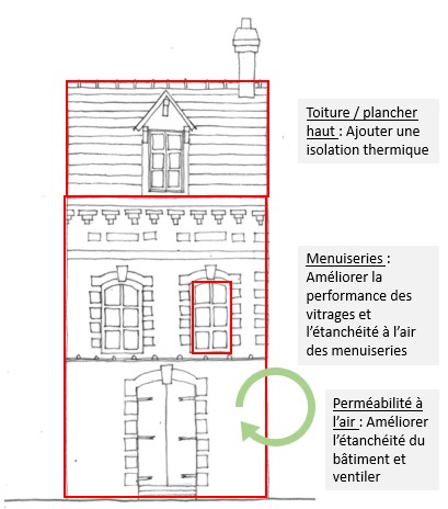 - Leviers pour améliorer la performance énergétique du bâtiment (3 points clés permettant d’améliorer la performance de l’enveloppe du bâtiment et qui ne déteriorent pas sa qualité patrimoniale) :