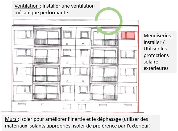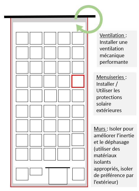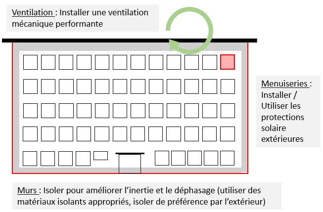 | Les aspects dégradant le confort en été : | Isolation thermique : Les parois et planchers haut ne sont pas isolés. Ils ne participent pas à limiter la montée en température du bâtiment, ni à conserver la fraîcheur en été. Étanchéité à l’air : La mauvaise étanchéité engendre des infiltrations d’air indésirables, dégrandant l’efficacité énergétique et le confort thermique en été. Inertie thermique / ouvertures : L’inertie moyenne des bâtiment ainsi que les nombreuses surfaces vitrées engendrent une surchauffe assez rapide des logements. |