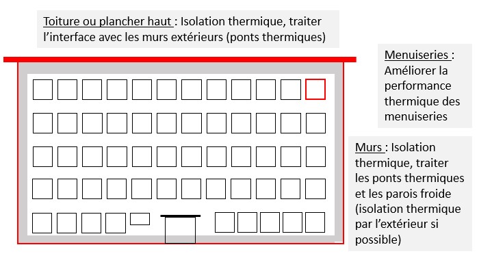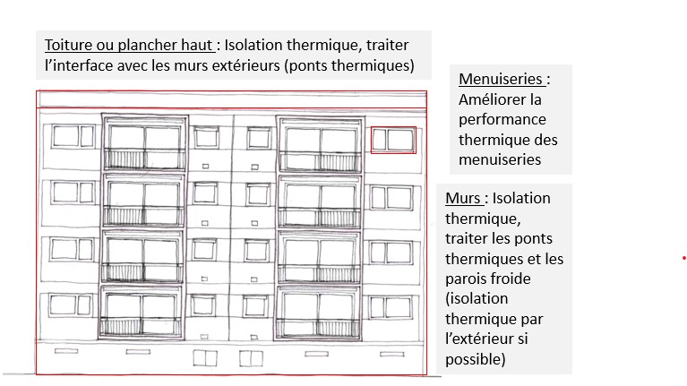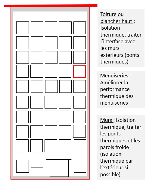 - Leviers pour améliorer la performance énergétique du bâtiment (3 points clés permettant d’améliorer la performance de l’enveloppe du bâtiment et qui ne déteriorent pas sa qualité patrimoniale) :