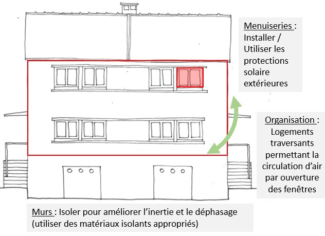 | Les aspects participant au confort en été : | Protections solaires : Les dispositifs tels que des volets roulants, stores ou brise-soleil limitent les apports solaires directs en été, réduisant les risques de surchauffe. Bien utilisés, ces systèmes permettent d’abaisser la température intérieure de 2°C et diminuer les besoins de rafraichissement (éviter d’installer des climatisations). Proportions d’ouvertures : Les ouvertures ne représentent que 10 à 20% de la surface de murs pour éviter les apports solaires trop importants. Zonage thermique : Les pièces de nuit sous combles deviennent très inconfortables en période de fortes chaleurs. Aménagements extérieurs : La végétation autour du bâtiment offre un confort visuel qui participe à se sentir bien dans les bâtiments. Cet aspect souvent négligé peut impacter le confort thermique des occupants. Les plantations hautes procurent de l’ombre et protègent les façades des apports solaires. |