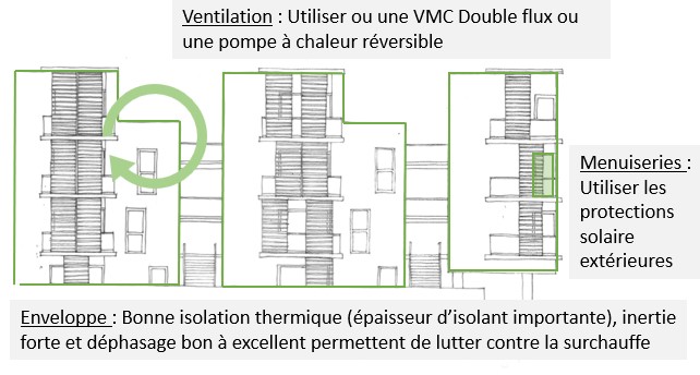 | Les aspects participant au confort en été : | Protections solaires : Les dispositifs tels que des volets roulants, stores ou brise-soleil limitent les apports solaires directs en été, réduisant les risques de surchauffe. Bien utilisés, ces systèmes permettent d’abaisser la température intérieure de 2°C et diminuer les besoins de rafraichissement (éviter d’installer des climatisations). Aménagements extérieurs : La végétation autour du bâtiment offre un confort visuel qui participe à se sentir bien dans les bâtiments. Cet aspect souvent négligé peut impacter le confort thermique des occupants. Les plantations hautes procurent de l’ombre et protègent les façades des apports solaires. Isolation thermique : Les parois et les combles présentent une isolation de qualité. Celà participe à améliorer le confort d’été des immeubles (même si on trouve encore des situations d’inconfort dans certains logements) Ventilation : La ventilation mécanique (VMC simple ou double flux) participe à l’amélioration du confort d’été. En particulier dans le cas de VMC double flux avec un fonctionnement réversible qui permet d’insuffler de l’air frais. Étanchéité à l’air : La bonne étanchéité permet d’éviter les infiltrations d’air indésirables. |